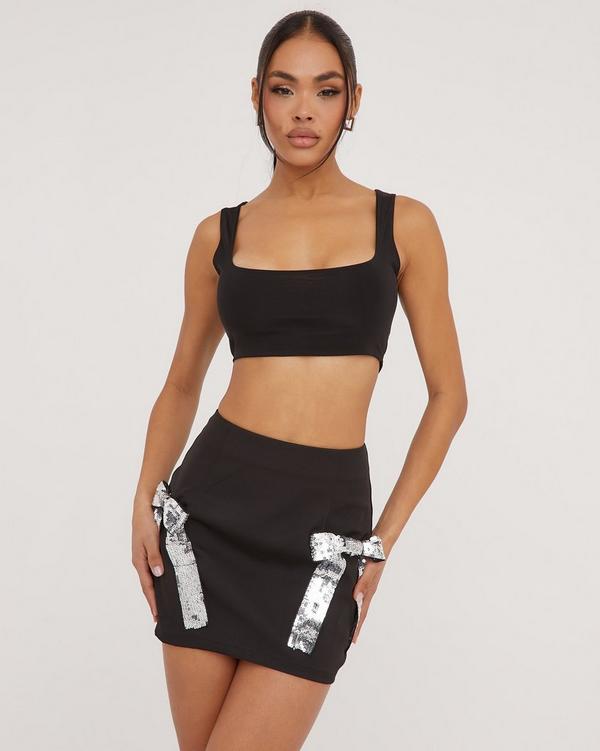 High Waist Sequin Bow Detail Mini Bodycon Skirt In Black Woven EGO Very well made.