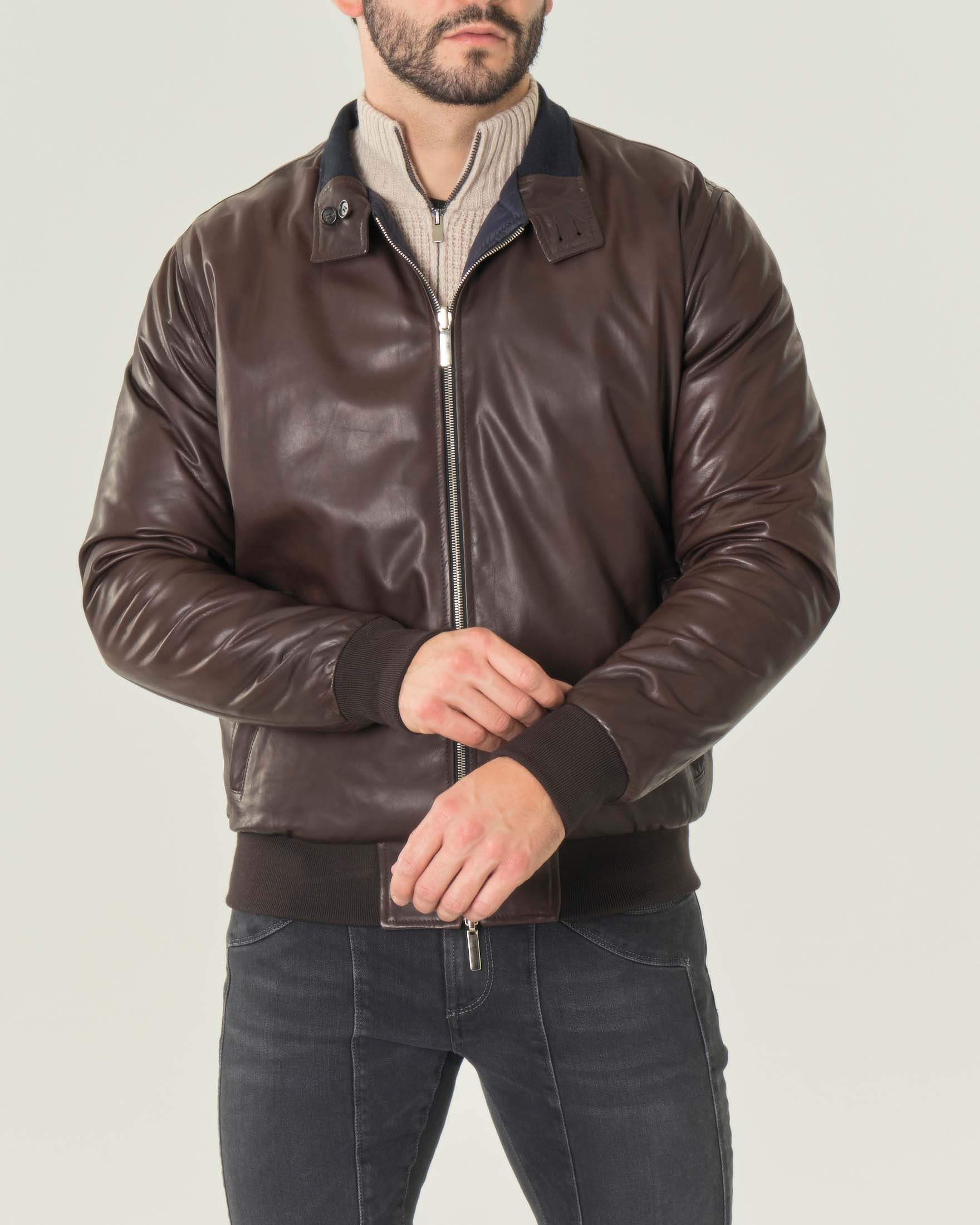 Bomber in pelle testa di moro reversibile in piumino blu Very well made.