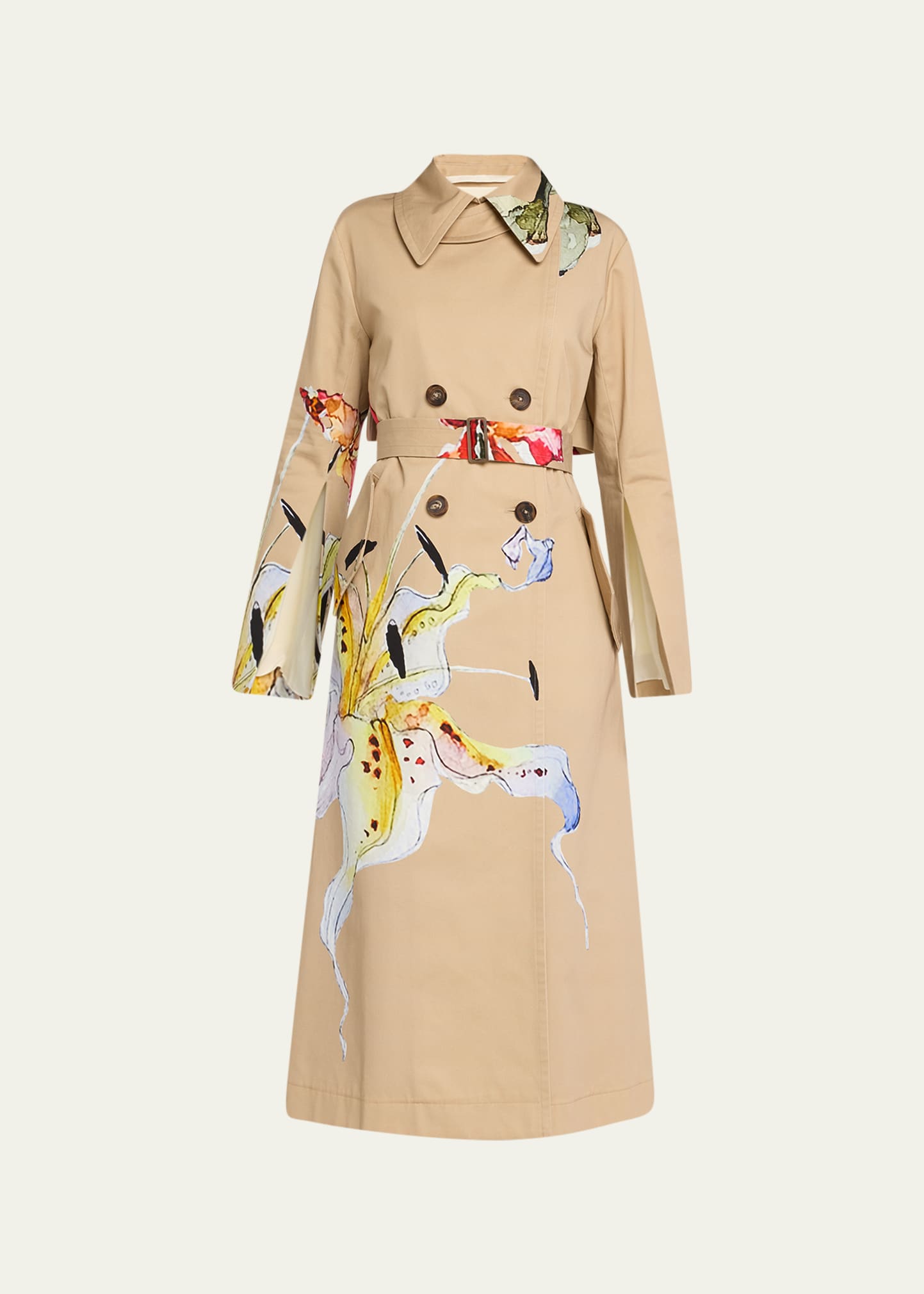 Sketch Print Cotton Gabardine Trench Coat In Brown Very well made.