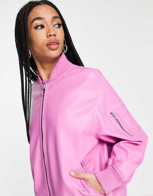 Bershka faux leather oversized bomber jacket in pink Very well made.