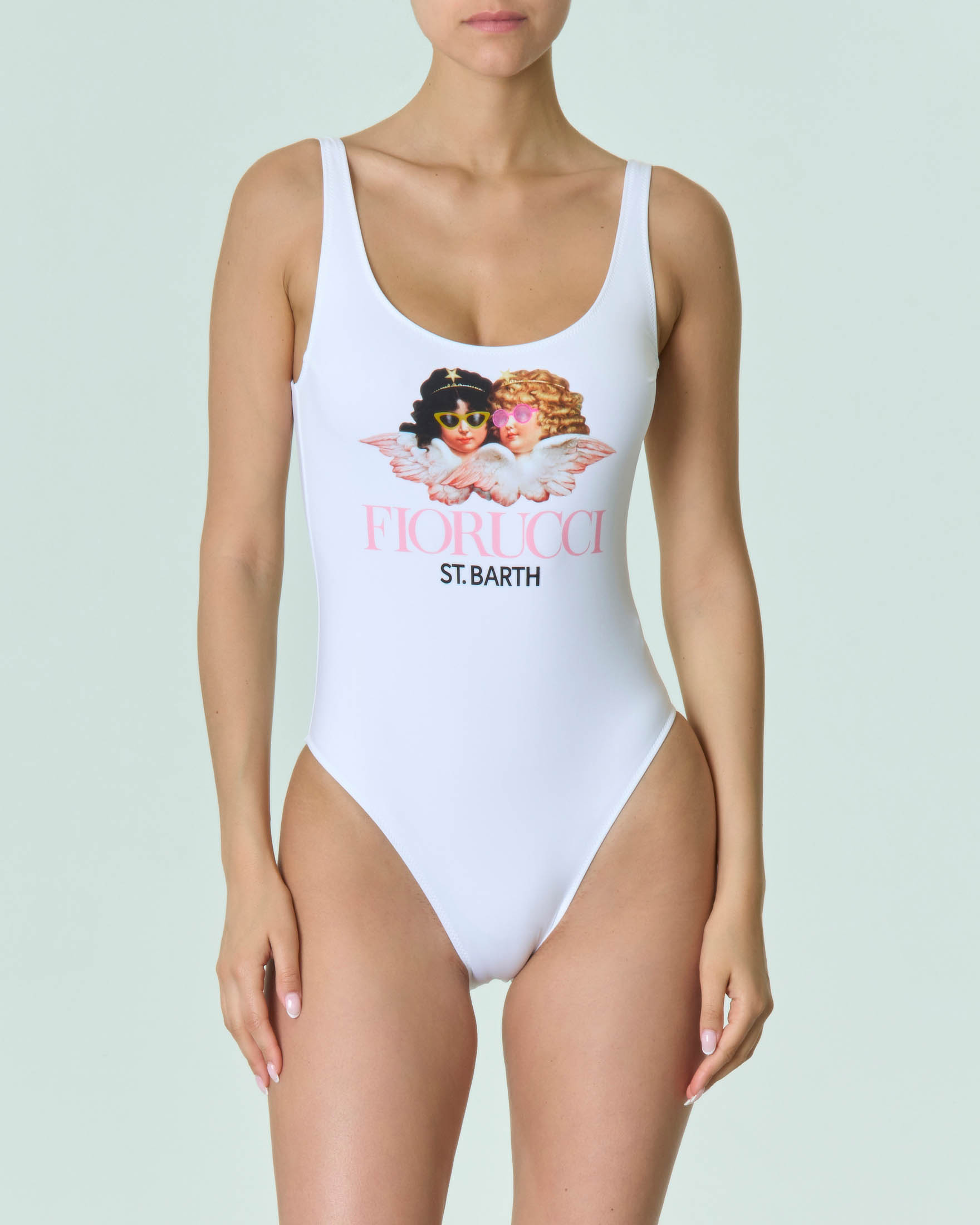 Costume intero bianco con stampa Angels Fiorucci sul davanti e Very well made.