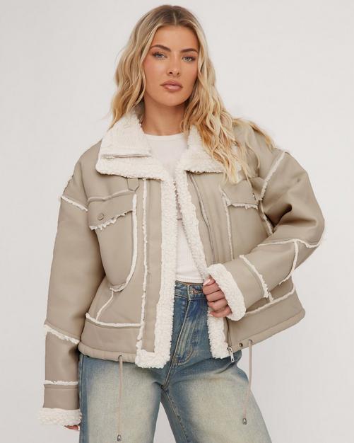 Pocket Detail Faux Shearling Aviator Jacket In Cream EGO Very well made.