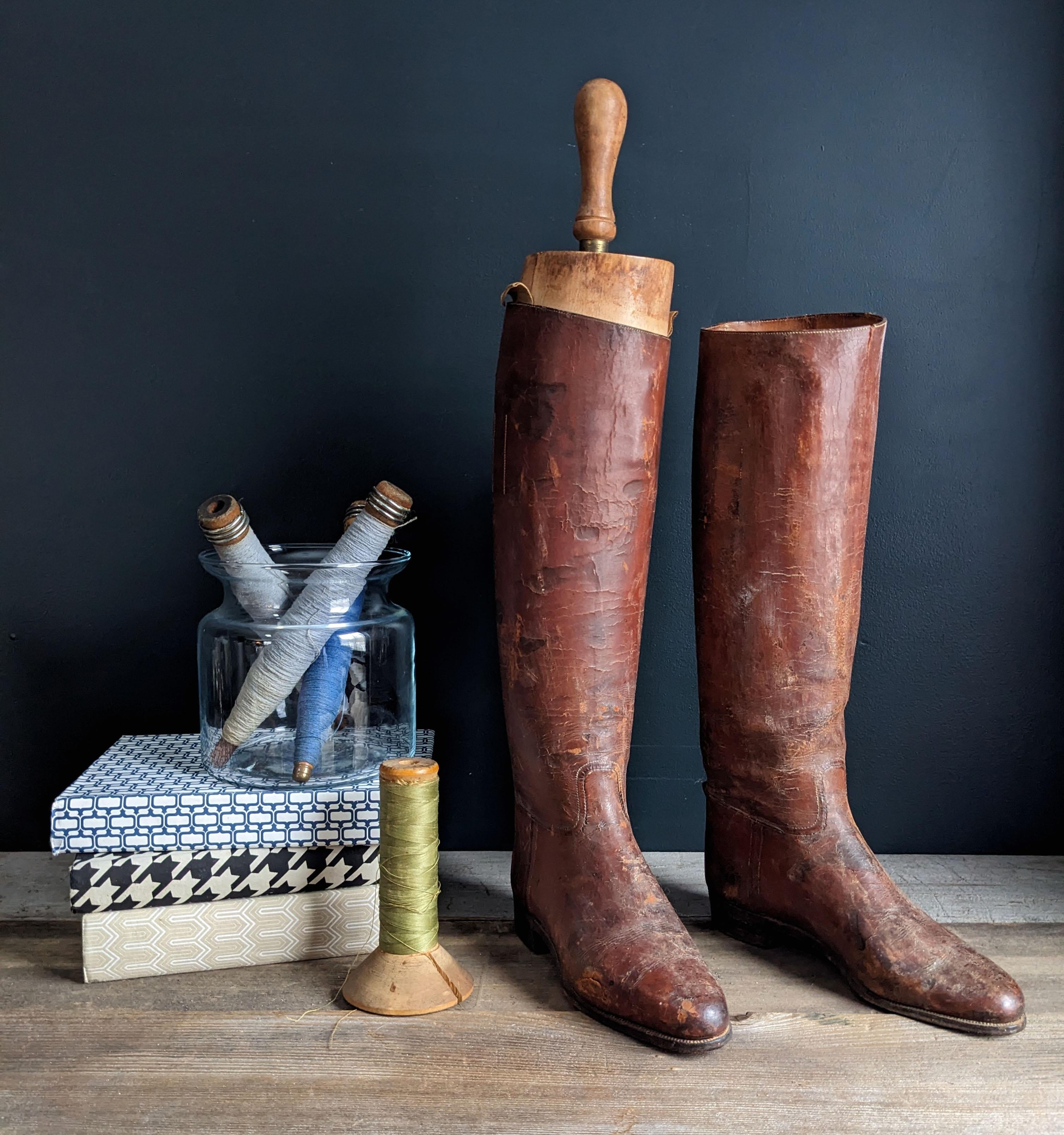 Antique Distressed English Bartley Sons Brown Leather Riding Boots With Wooden Boot Tree Form Very well made.