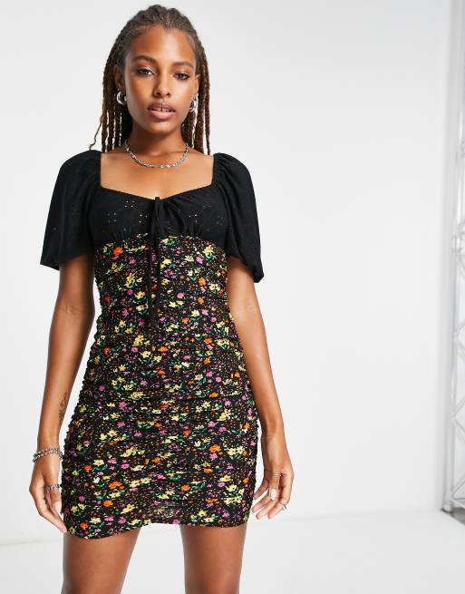 ASOS DESIGN mini broderie mix mini ruched dress in ditsy print in black Very well made.