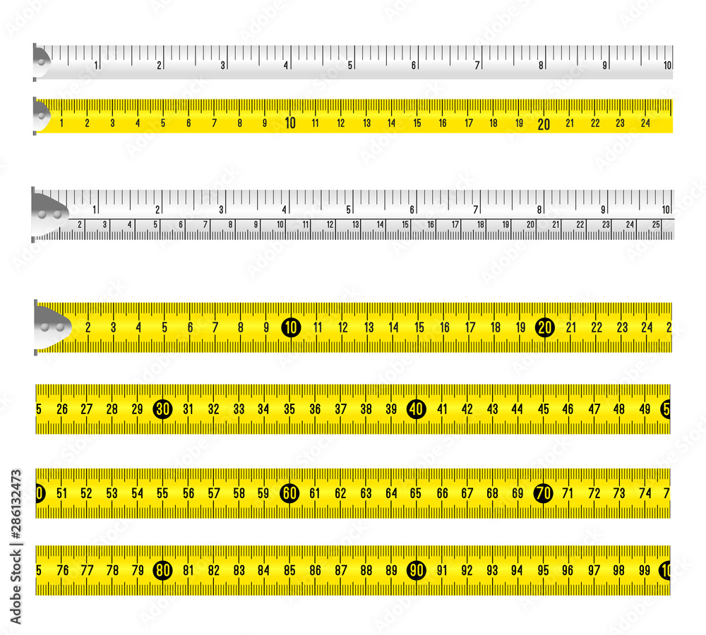 Ruler measuring tapes. Vector long tape set for measure inches Very well made.