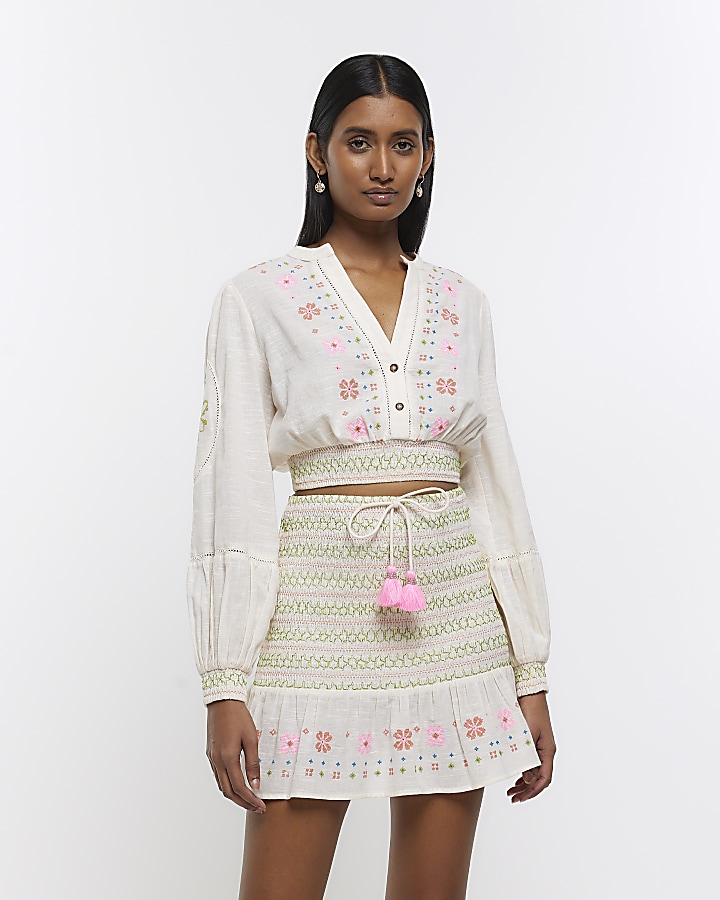 Floral Embroidered High Waist Ribbed Mini Skirt Camel FINAL SALE Very well made.