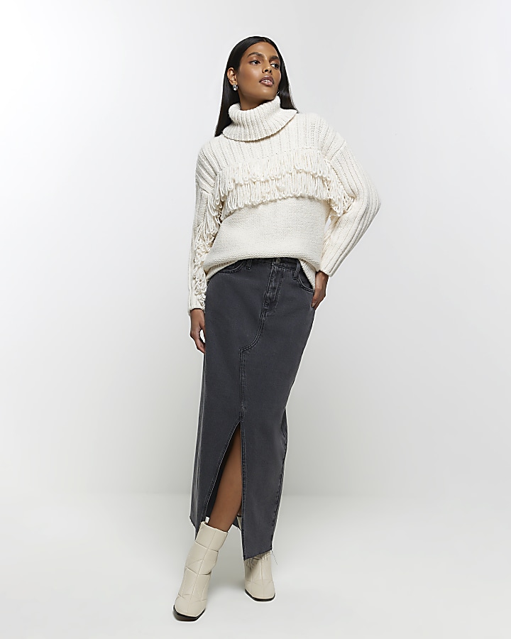Astrid Shirred Thigh High Split Mid Rise Maxi Skirt in Sky Grey Very well made.