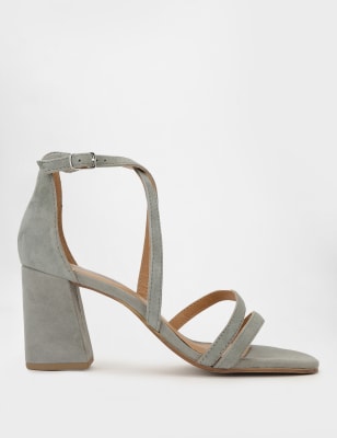 EMANI STRAPPY MID HIGH BLOCK HEELS PEEP TOE IN LIGHT GREY SUEDE Very well made.