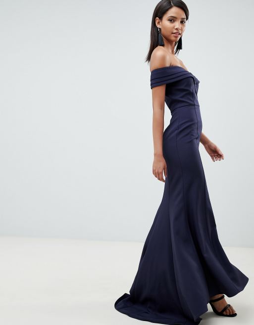 Jarlo pleated off shoulder bardot maxi dress in navy ASOS Very well made.