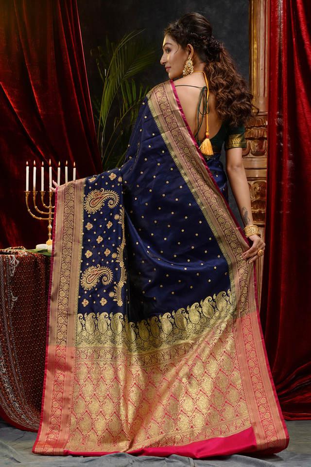 Navy Blue Banarasi Handloom Satin Silk Saree With Embroidery Work with Blouse Piece Very well made.