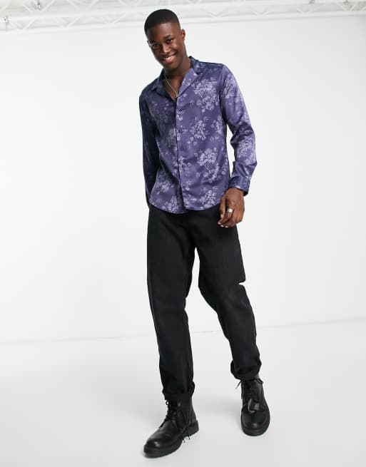 New Look tonal long sleeve floral satin shirt in blue Very well made.