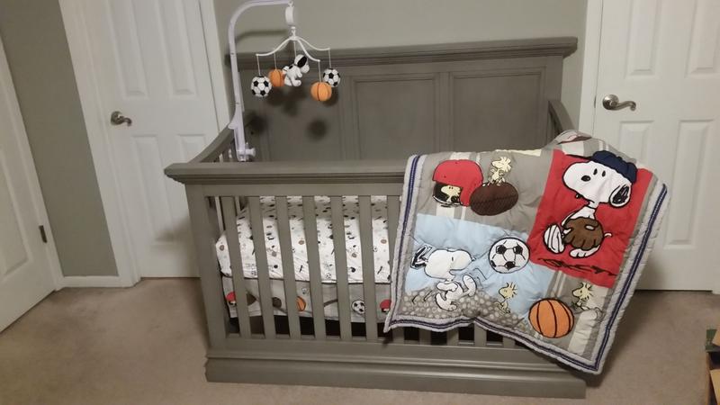 Snoopy Sports Gray Blue Yellow Red 3 Piece Nursery Baby Crib Very well made.
