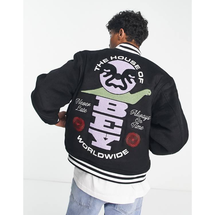 Obey time varsity bomber jacket in black with chest and back Very well made.