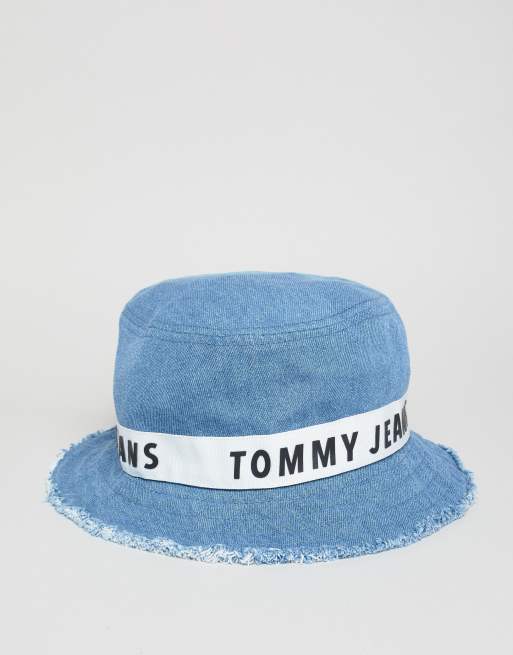 Tommy Jeans Taped Logo Denim Bucket Hat Frayed Edge in Mid Wash Very well made.