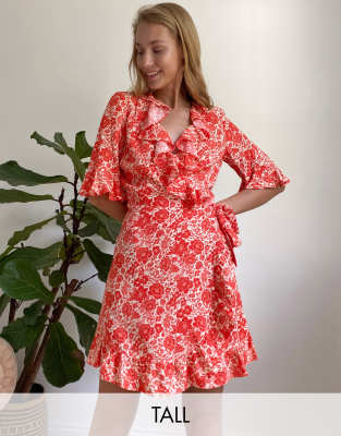 Topshop Tall wrap mini tea dress in red floral Very well made.