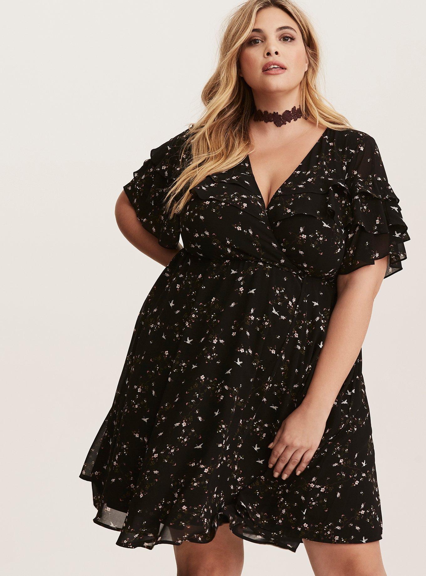 Plus Size Black Floral Print Chiffon Ruffled Wrap Dress Torrid Very well made.