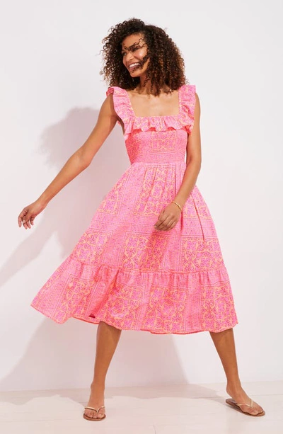 Vineyard Vines Mix Print Smocked Ruffle Cotton Midi Dress In Very well made.