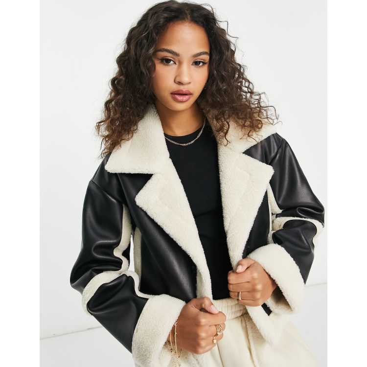 Stradivarius cropped faux leather aviator jacket with contrast trim in black Very well made.