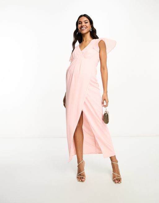 TFNC Maternity Bridesmaid flutter sleeve ruffle detail maxi dress in blush Very well made.