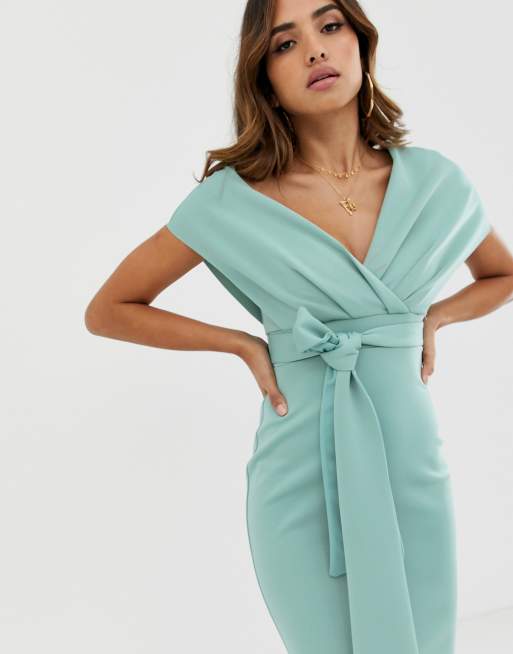 ASOS DESIGN fallen shoulder midi pencil dress with tie detail ASOS Very well made.