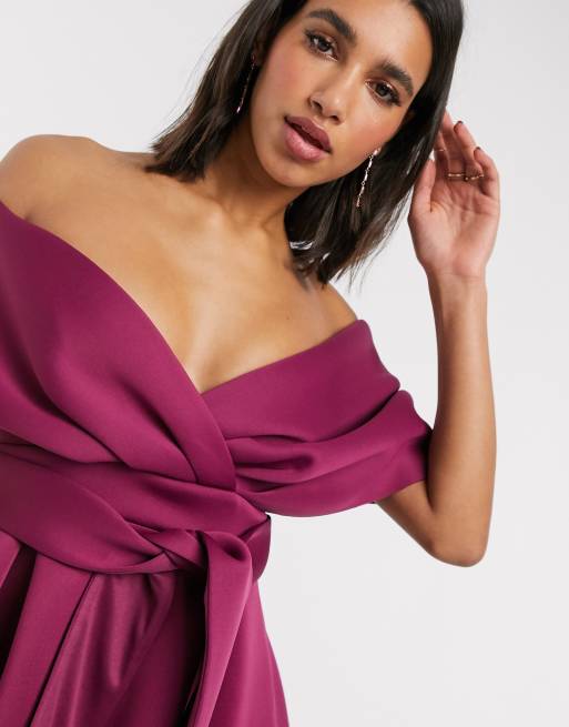 ASOS DESIGN fallen shoulder skater mini dress with tie detail in raspberry Very well made.