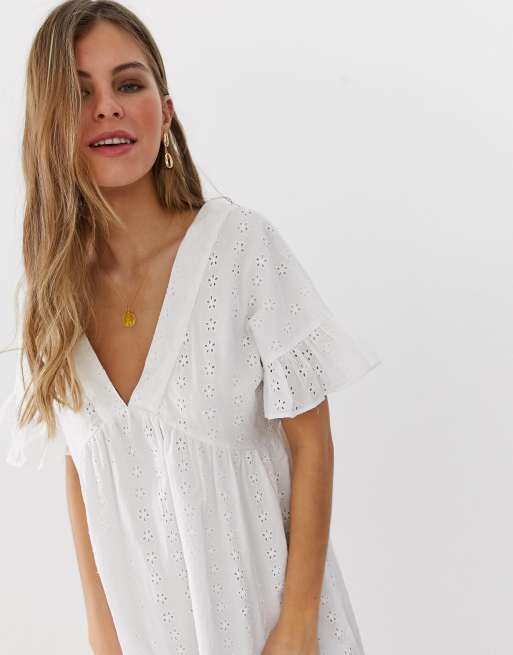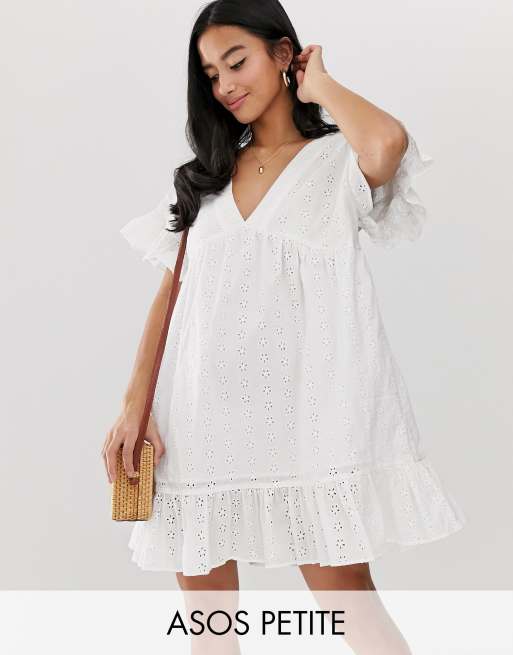 ASOS DESIGN Petite v front v back smock mini dress with pep hem in broderie Very well made.