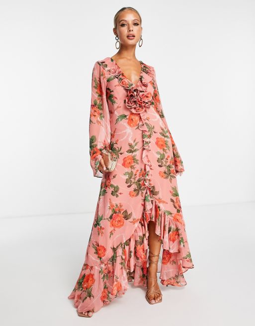ASOS DESIGN ruffle asymmetric maxi dress in abstract print Very well made.