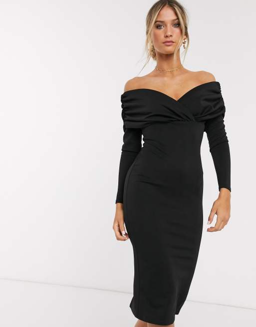 ASOS DESIGN scuba bardot ruched side long sleeve midi dress in black Very well made.