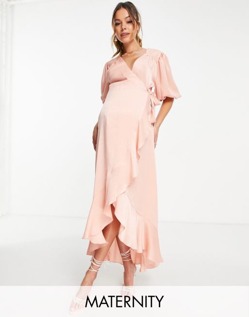 Flounce London Maternity puff sleeve maxi wrap dress in light pink satin Very well made.