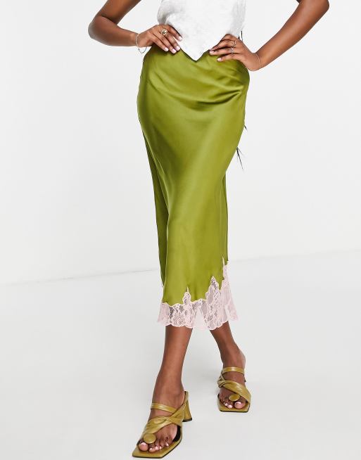 ASOS DESIGN satin midi skirt with contrast lace trim in olive Very well made.