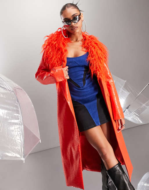 ASYOU snake embossed PU coat with shaggy faux fur trim in orange Very well made.