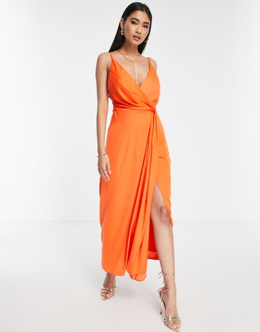 ASOS DESIGN Petite satin cami maxi slip dress satin with lace up back in orange Very well made.