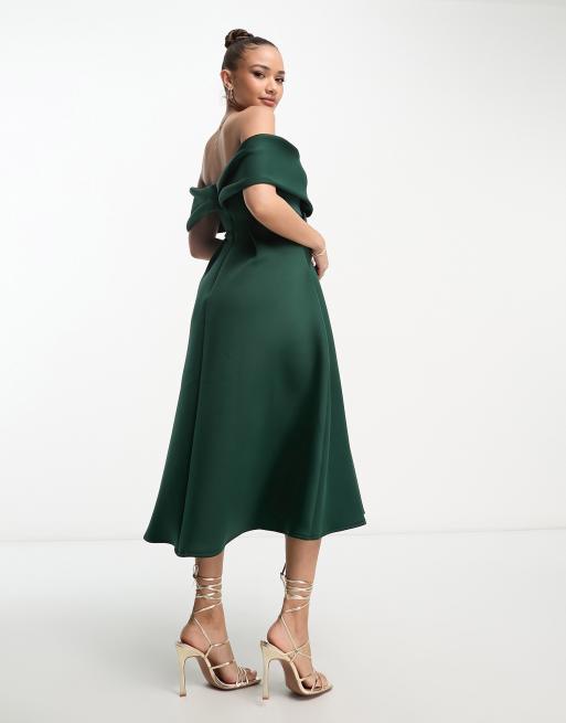 ASOS DESIGN twist off the shoulder prom skater midi dress in forest green Very well made.