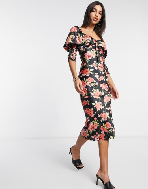 ASOS DESIGN satin bias midi tea dress with shirred cuffs in rose floral print Very well made.