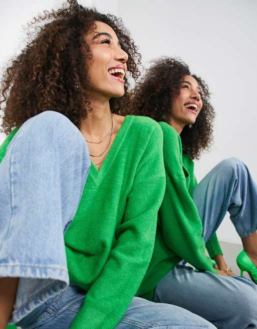 ASOS DESIGN V neck sweater with textured sleeve in green Very well made.