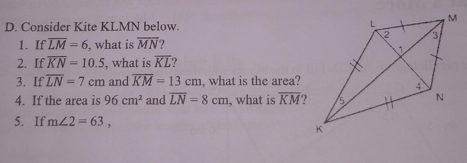Solved 2 t D. Consider Kite KLMN below. 1. If LM 6 what Chegg Very well made.